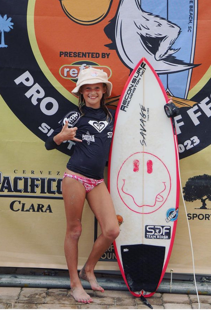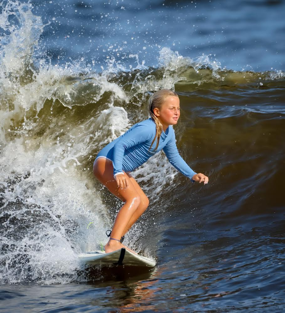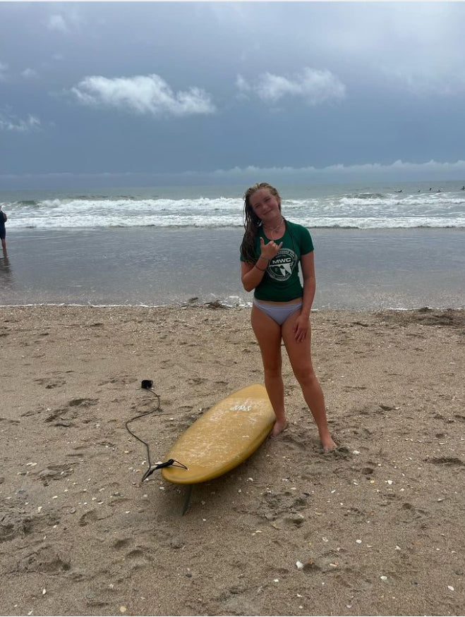 Hi I am Maggie! I started surfing when I was 7 years old in Surf City and Wrightsville Beach. I watched the incredible story of Bethany Hamilton, that changed my life. How she overcame an injury surfing, but it never stopped her dream of surfing really inspired me. I fell in love with the feeling of being free out on the water when I caught my first wave and I was hooked. When you are paddling for a wave, it can sometimes be scary. You don’t know if you will stand up, wipe out or get tangled - but you could have the best wave of your life. Surfing has taught me to not let fear guide my decisions in whatever I want to accomplish. I started competitive surfing at the end of 2022 in push in heats and I loved it! I am having fun competitively surfing now in ESA Mid Atlantic and the National Scholastic Surf Association (NSSA) competitions. I love the ocean and all of it’s power, beauty and the way it makes me feel when I ride a wave. There is something so special about the ocean. I want to help keep our oceans clean and make it an even better place each time I surf. My dream is to be a surfer representing my country on the USA Surf Team and be a surfer for WSL one day. As a military kid, my Dad has shown me, true American Spirit, that I can have courage to overcome any obstacle and to not let fear get in the way of trying. I want to encourage and support young kids to feel safe and learn how to surf, because surfing has brought me so much joy and great friendships. I think being outside in nature and taking care of our oceans is the greatest gift we give ourselves.