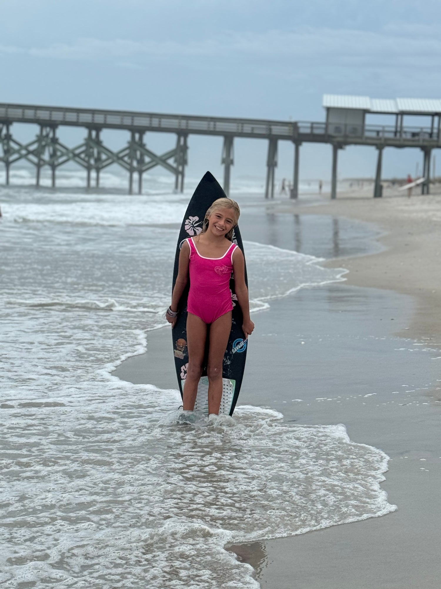 My name is Elsa Stinson, I am 15 years old, and i love surfing. I have been surfing for about 4 years, beginning and progressing with mermaid surf, and I am now working as a junior instructor for mermaid surf school. I began working towards short boarding and in the summer of 2024 I decided to start long boarding as well. I surf almost everyday year round improving as much as I can no matter the conditions. While surfing is the best, and definitely one of my favorite things, I also have many other hobbies like scuba diving, snorkeling, jewelry making, and watching and surfing in sunrises at the beach. I am going to begin high school as a freshman this year at Ashley high school in the marine biology program. I have a strong love for the ocean, but also animals. I have a dog, cat, snails, shrimp, and a fish that I love very much. I love to be an ambassador, because I not only enjoy getting cool, good quality clothes and bathing suits, but also supporting awesome surfing brands. I love absolutely every part of surfing, even when the paddling gets painful and the bad wipeouts, but more specifically I love the friendly community, the peacefulness, the stoke of catching a great wave, and the way surfing clears my mind and just makes me happy. My go to quote is “the best surfer out there is the one having the most fun” -Phil Edwards.
